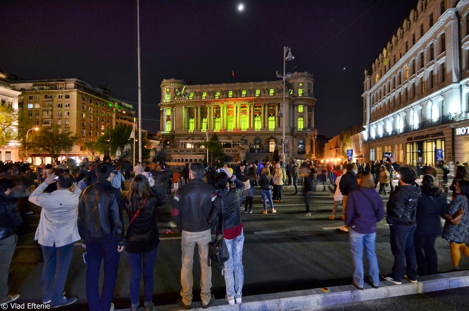 O seara superba in Bucuresti, festivalul international de lumini Spotlight a oprit circulatia pe Calea Victoriei si a transformat centrul intr-un spatiu cu nuante SF, socializare si explorare vizuala fantastica in Bucurestiul de aprilie 2015 🙂 Cateva imagini, de la Piata Natiunilor Unite, pana la Piata 21 Decembrie:
